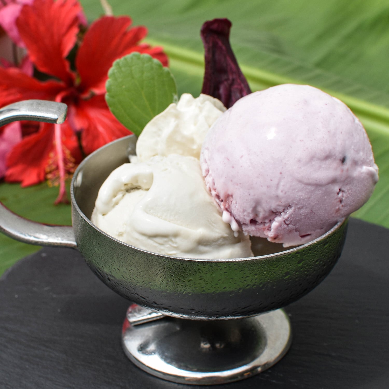 島の太陽と大地の恵みがたっぷり詰まった古宇利島産のサトウキビと紅いもを使ったプレミアムアイスクリームをお届け。